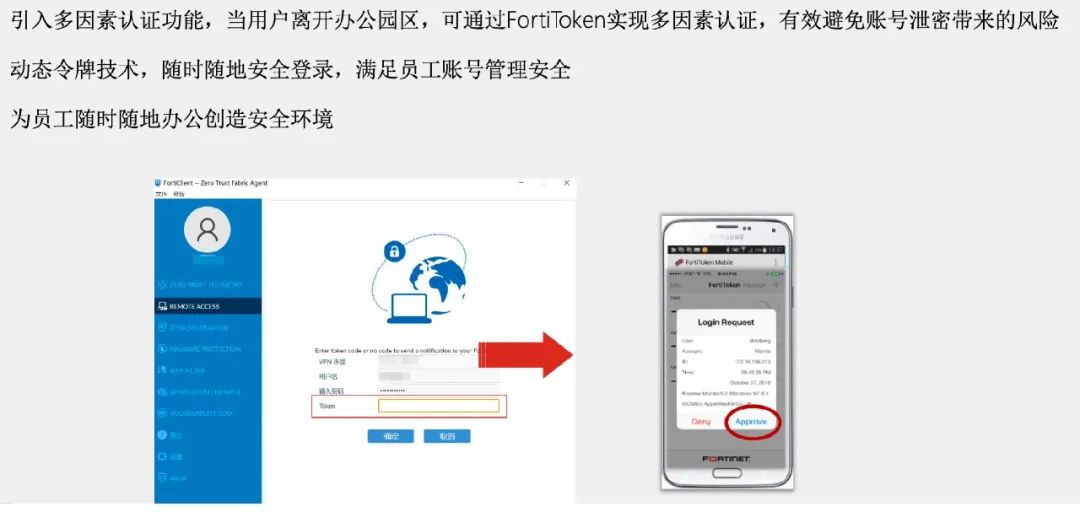 FortiToken 提供双因素身份验证,使用带有推送通知的一次性密码 (OTP) 应用程序或基于硬件时间的 OTP 令牌。FortiToken通过动态密码生成增强访问安全性,FortiClient作为终端管理软件,为每台终端设备提供零信任网络访问(ZTNA),确保其仅能访问授权资源。
