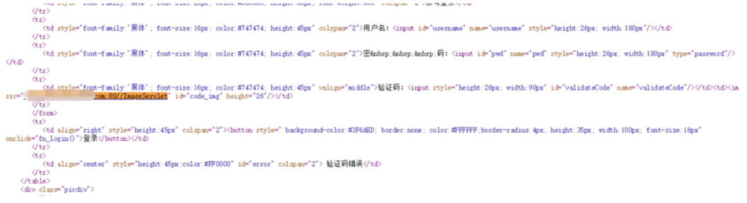 在挖掘验证码问题中,一般情况下会先通过抓取数据包验证常见的逻辑错误、暴力破解、短信轰炸等问题。此处讲解下检查源码方式,直接右键检查验证码的html代码,可以看到验证码是客户端通过一个img标签进行请求刷新的,<imgsrc="http://xxxx.xxxx:80//ImageServlet"id="code_img"height=“26”/>,此处src地址即为验证码地址。