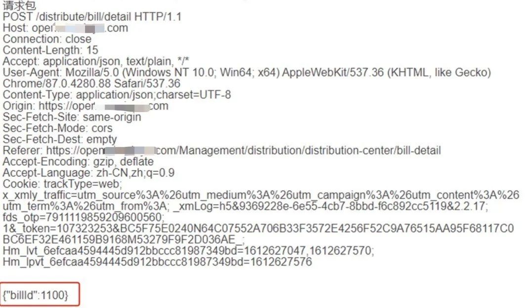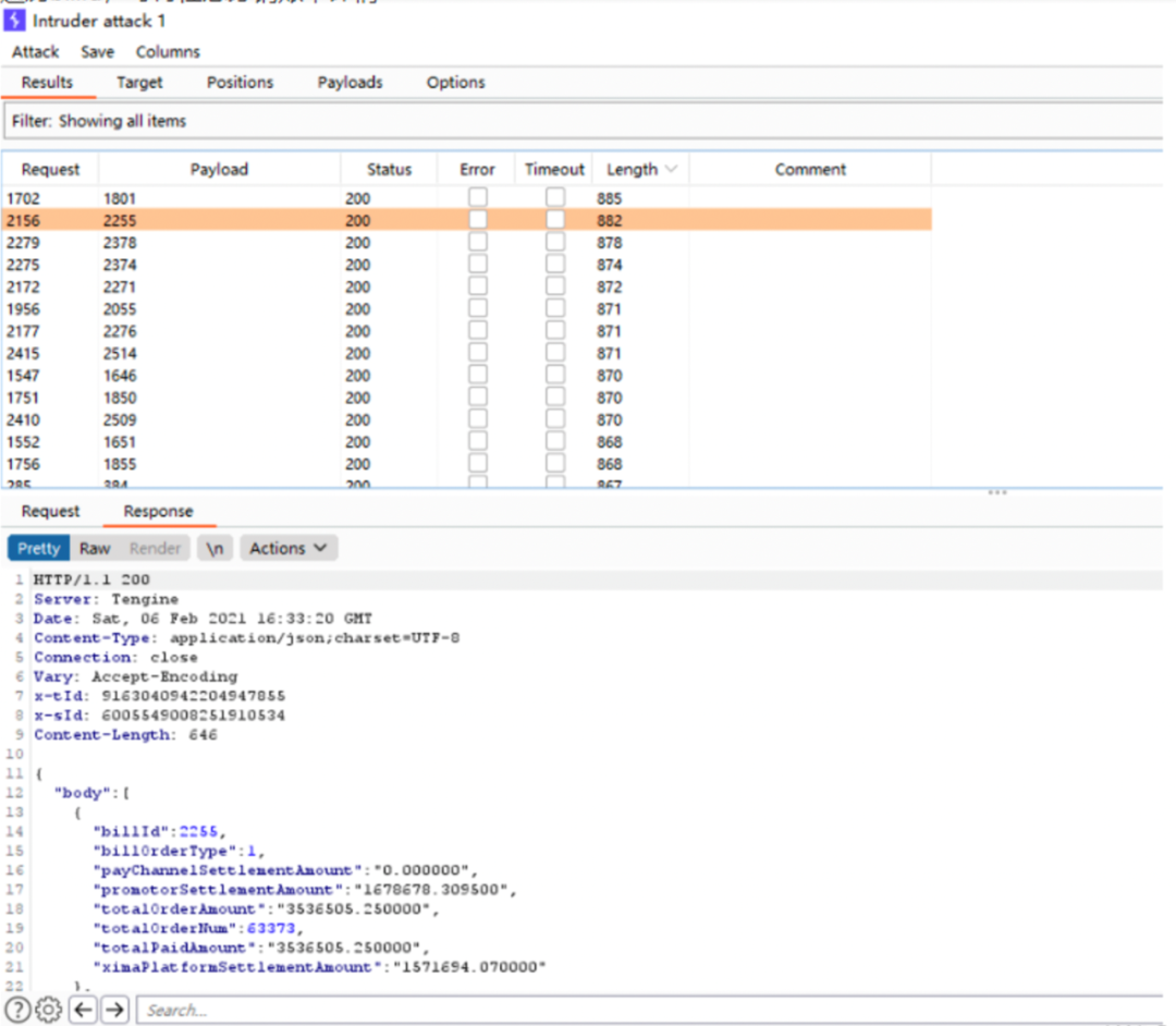 更改一个不在账户权限下billld,发现仍可正常返回,使用intruder对billld参数进行遍历,并对length排序,可得多条有效payload对应的订单明细,理论上遍历的参数值范围够大,可得全站分销账单明细。