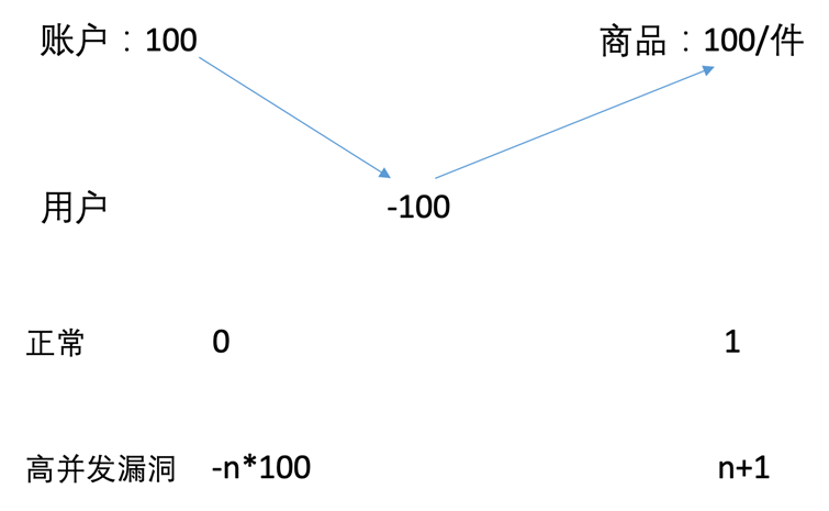 假设用户的账户余额100元,某商品单价100元/件,当用户使用账户余额购买此商品时只能购买一件数量,且购买成功后账户余额归零。但当业务存在高并发漏洞时,扣款的同时数据库未落锁,导致账户余额可能减少至负数,购买到的商品也可大于一件。