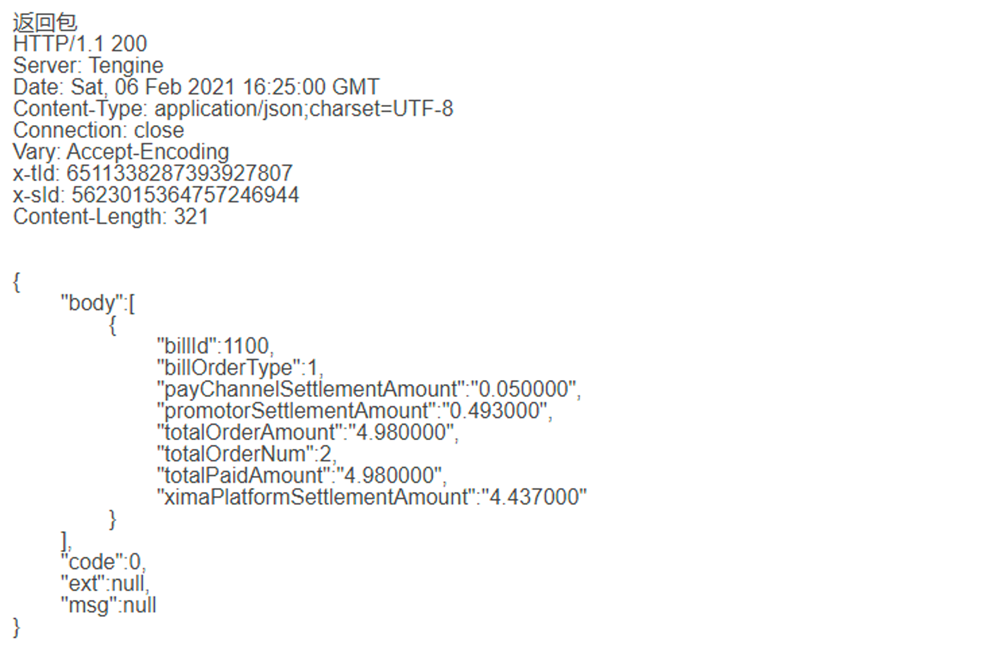 登陆账户后,任意选择一个分销账单,点击订单明细查询,使用burpsuite进行抓包,可以看到查询的参数只有”billld”一个选项,且参数值为简单的4位数字,返回包中含明文的订单明细信息:
