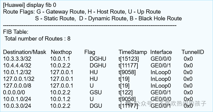 **路由表:**可以将路由表视为位于路由器的控制平面,实际上路由表并不直接指导数据转发。路由器在执行路由查询时,并不是在路由表中进行报文目的地址的查询,真正指导数据转发的是FIB表,路由器将路由表中的最优路由下载到FIB表,此后如果路由表中的相关表项发生变化,FIB表也将立即同步。