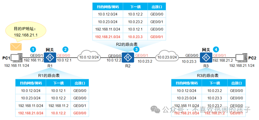 R3收到后查找路由表项,发现IP报文的目的IP地址属于本地接口所在网段,则直接本地转发,最终该报文被发往目的主机PC2。