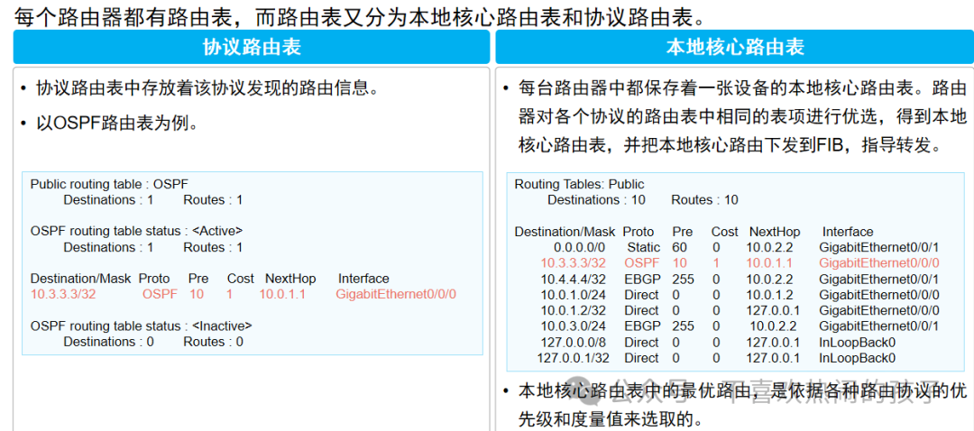 每个路由器都有路由表,而路由表又分为本地核心路由表和协议路由表。