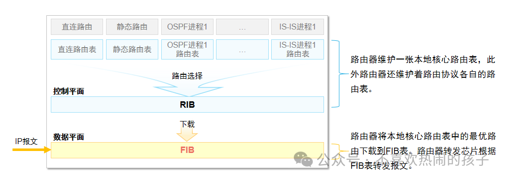 总的来说就是路由器根据不同的路由协议进行比较,最优的路由条目会下发同步到FIB转发表,实际上设备是根据FIB进行转发,但是由于一般情况下两者相似一致,所以也说依据路由表转发。