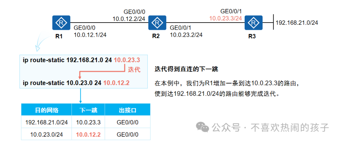 如果到达目的网段的下一跳不可达,需要再增加一条目的网段为下一跳网段的路由,逐条路由。