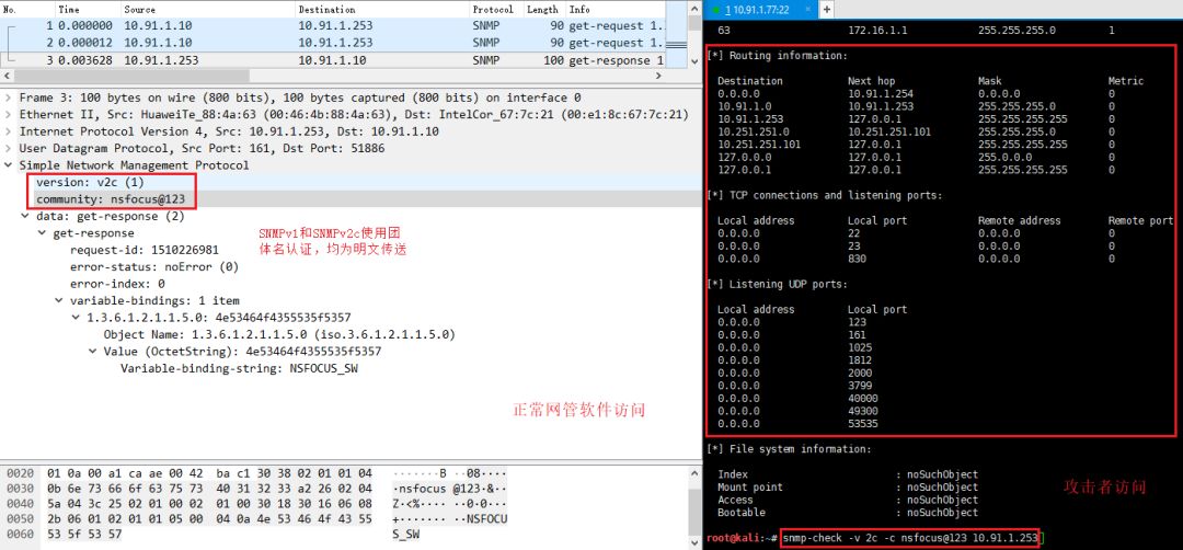 SNMP协议的v1、v2c版本使用团体名认证均为明文传送,容易被攻击者窃听。SNMPv3采用USM技术,提供了认证和加密功能,对传输报文进行加密。