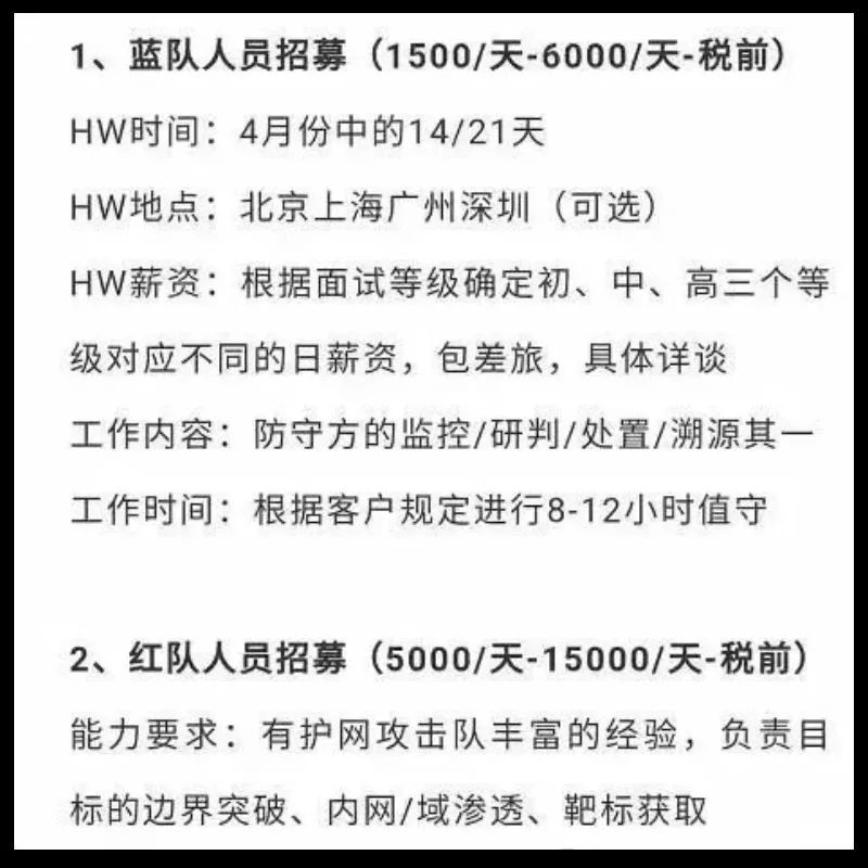 每年的HW行动都会招募大量网络安全技术人才,待遇普遍在1.5-3K/天,15天下来,收入可达到2-5W。(未毕业的学生,只要有web渗透测试能力也可以参加,红队人员最高日薪甚至能达到15K)