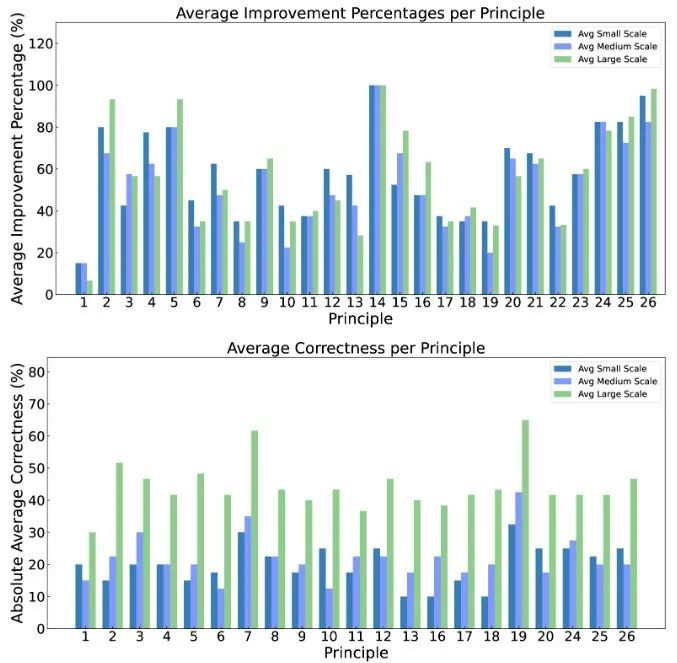 根据实验结果,**在所有规模的LLM上,26 条原则均能显著提升响应质量,特别是在大模型(如 GPT-4)上,这些原则带来的改进更为显著。**对于小规模和中等规模的模型,平均绝对准确性可以达到 10%至 40%,而对于大规模模型,准确率可以超过 40%。