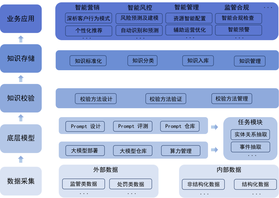 光大知识库构建平台利用人工智能大模型知识广泛、数据处理能力强等优势,同时结合金融领域文本数据特色进行知识抽取最终赋能于各类金融系统。图1是光大知识库构建平台系统架构图,目前该平台以知识服务为目标,将数据采集、底层模型、知识校验以及知识存储等知识组织过程,有条不紊地串联打通,形成一个不断改进和循环的知识构建和服务链条。