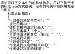 为了让Prompt设计过程更直观,以下以“给出示例式”Prompt为例对其设计过程进行简单阐述。如图2所示,“给出示例式”Prompt主要由三部分组成:示例、问题、新文本(需处理文本);而示例由问题、示例文本、示例结果组成,其中此处文本与结果来自训练集(若面对任务有公开数据集)或人工标注(若面对任务无公开数据集),注意此处人工标注只需标注少量样本即可。上述各个部分具体示例如图2所示,两个“问题”部分需保持一致,具体示例如图3所示,为了保证输出结果的一致性和通用性,“问题”中增加了具体需求如输出格式(如json格式)。“示例文本”具体示例如图4所示、“示例结果”具体示例如图5所示,两者分别是当前任务文本以及当前任务理想结果;注意“给出示例式”Prompt可拥有多个“示例”部分,但数量需根据所使用大模型输入长度限制,过长的输入文本会影响大模型文本处理效果。“新文本”具体示例如图6所示,其为当前任务所需处理文本,此处是自动检索数据集填充至整体Prompt中。