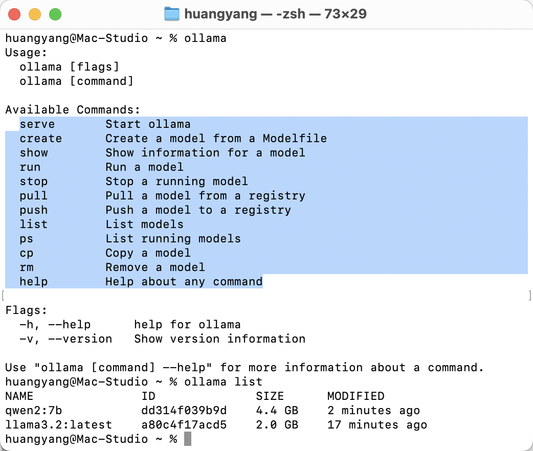 虽然 Ollama 没有 GUI(软件窗口)界面,但工具能做的操作并不多,也不复杂,只要在终端窗口输入 ollama 并回车,就能看到 ollama 的用法。