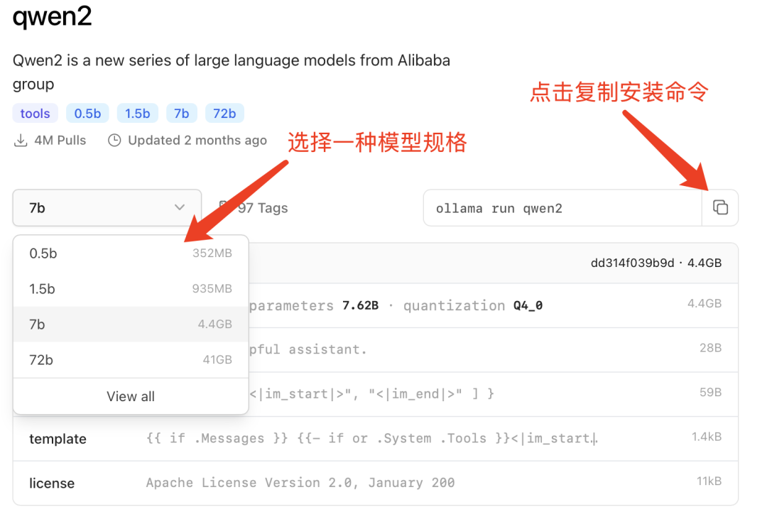 比如我们想下载阿里的「通义千问」大语言模型「qwen2」,先选择一种模型规格,简单来说规格数越大,模型体积越大,模型越“聪明”,但对电脑的性能要求越高。