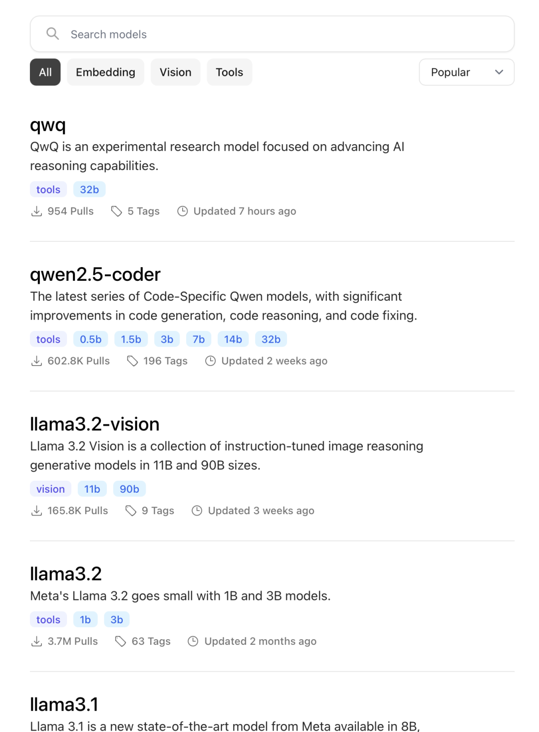 在 Ollama 官网点 Models 就可以查看或者搜索所有的本地模型。