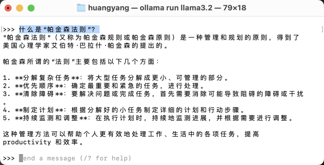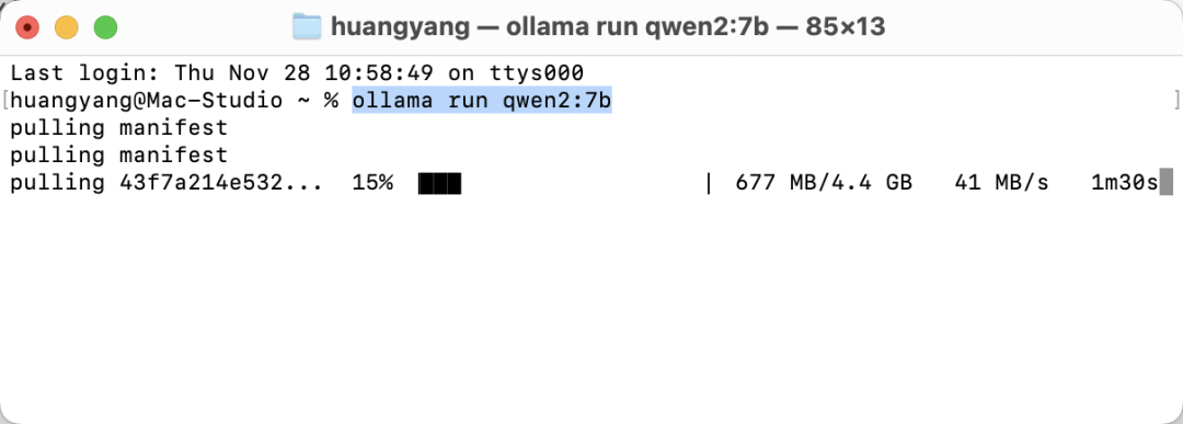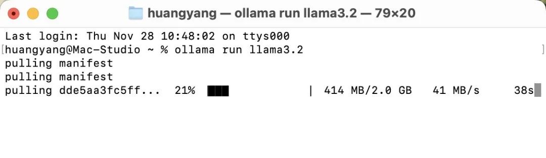 复制 ollama run llama3.2 这行命令,打开 macOS 终端窗口,粘贴并回车,接着开始下载 llama3.2 这个本地模型,这个模型有 2GB。