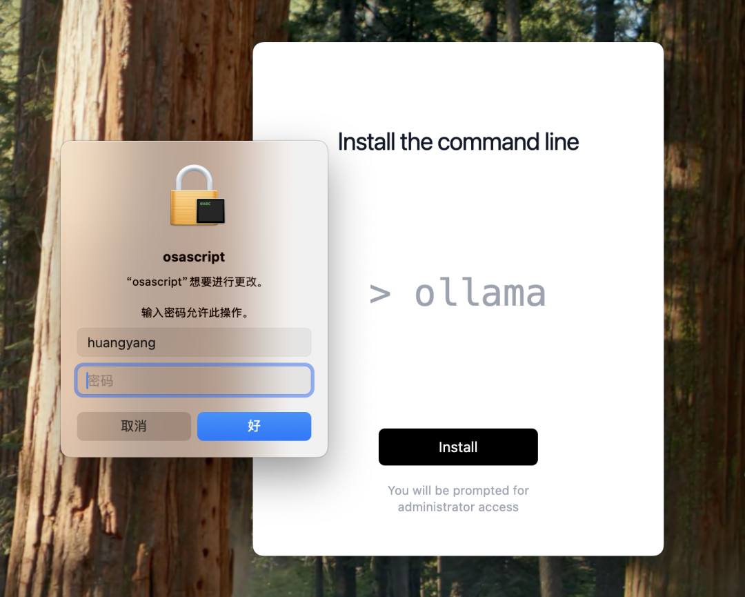 第一次打开 Ollama 会提示安装命令行工具(Ollama 本身并没有 GUI(软件窗口)界面),输入 Mac 用户密码授予权限就行了。