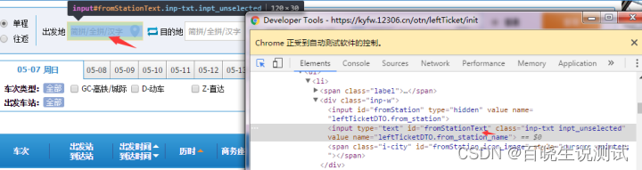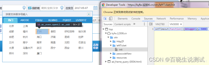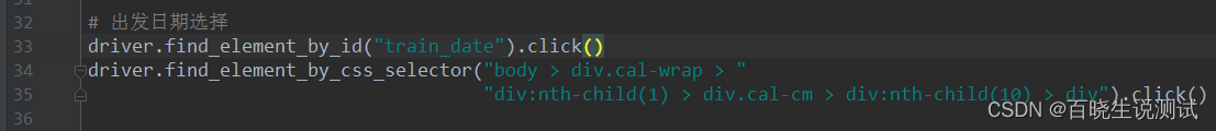 #出发地选择 driver.find_element_by_id(“fromStationText”).click() # setTimeout(function(){debugger;}, 5000) driver.find_element_by_css_selector(u"[title=广州]").click() time.sleep(5)