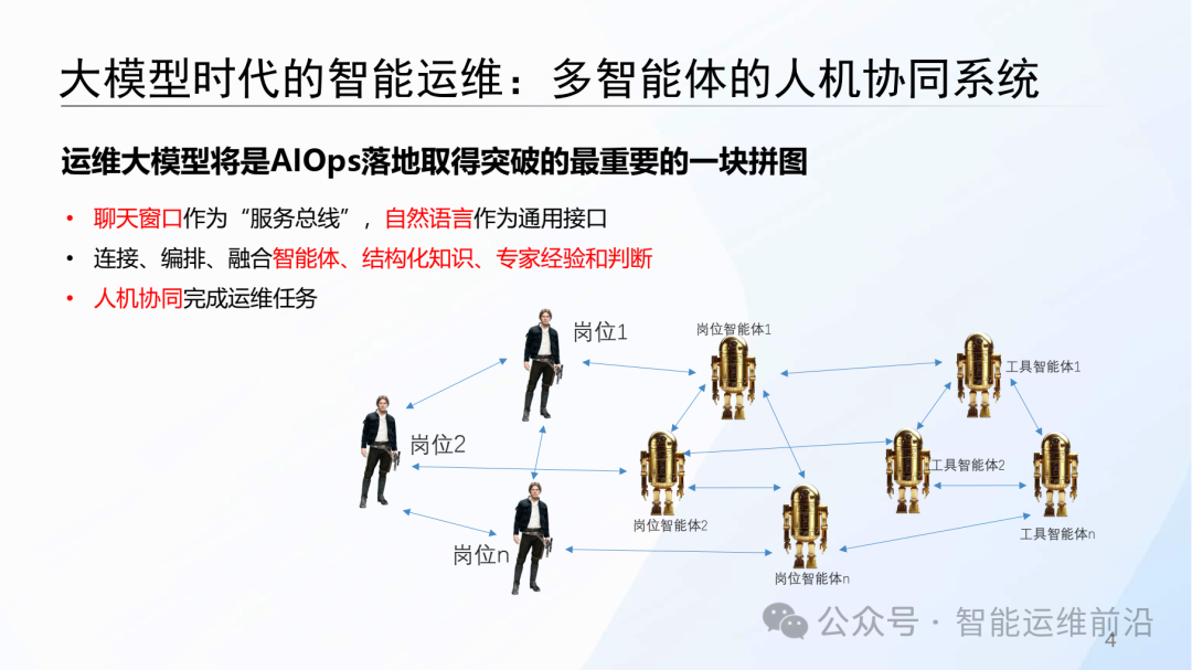 张圣林提出了大模型时代智能运维的新模式——多智能体的人机协同系统。该系统将聊天窗口作为处理运维事故的服务总线,以自然语言作为通讯接口,连接各种智能体、结构化知识和专家经验。通过人机协同来完成运维任务,而非替代专业工程师的工作职能。