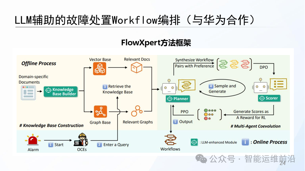 为实现故障处置Workflow的高效生成,团队基于文档理解构建知识图谱,以此增强检索生成能力,创建Knowledge base。通过Planner和Scorer两个智能体的协同工作,利用强化学习优化Planner,使其能够生成更有效的Workflow。
