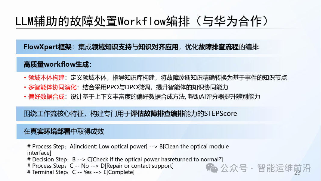 在宣讲会上,他着重分享了与华为合作的故障处置Workflow编排项目,该项目通过构建基于图的检索增强生成系统,利用大模型理解故障处理手册,生成故障处置的Workflow。