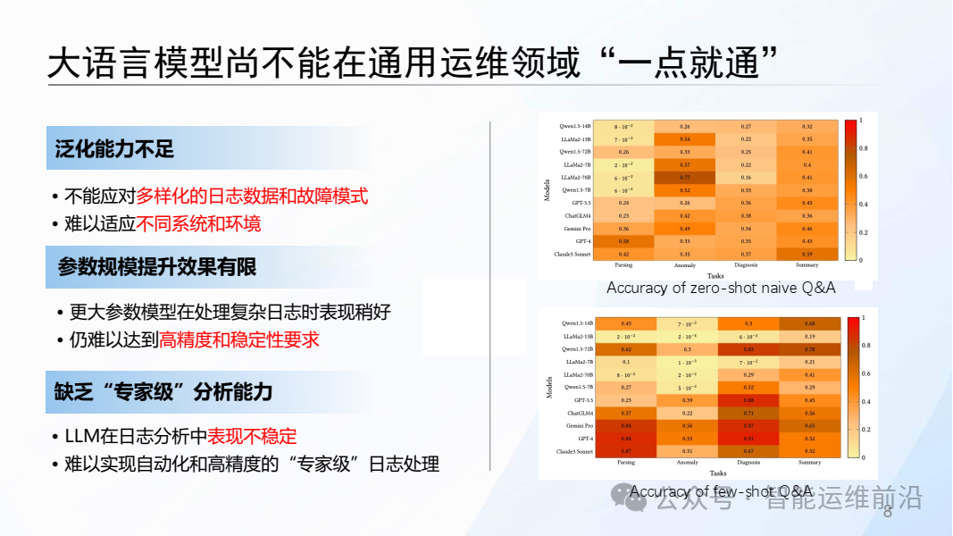 在对大模型在日志分析任务上的表现进行深入评估后以下结论:大模型在日志分析任务上的发放能力明显不足,生成的解决方案的有效性和准确性不够高;单纯增加模型的参数规模对提升性能的效果有限,仅靠扩大模型规模难以解决所有问题;大模型在日志分析领域还缺乏专家级的分析能力,无法像经验丰富的运维工程师那样精准地定位和解决问题。