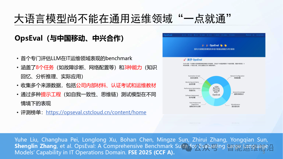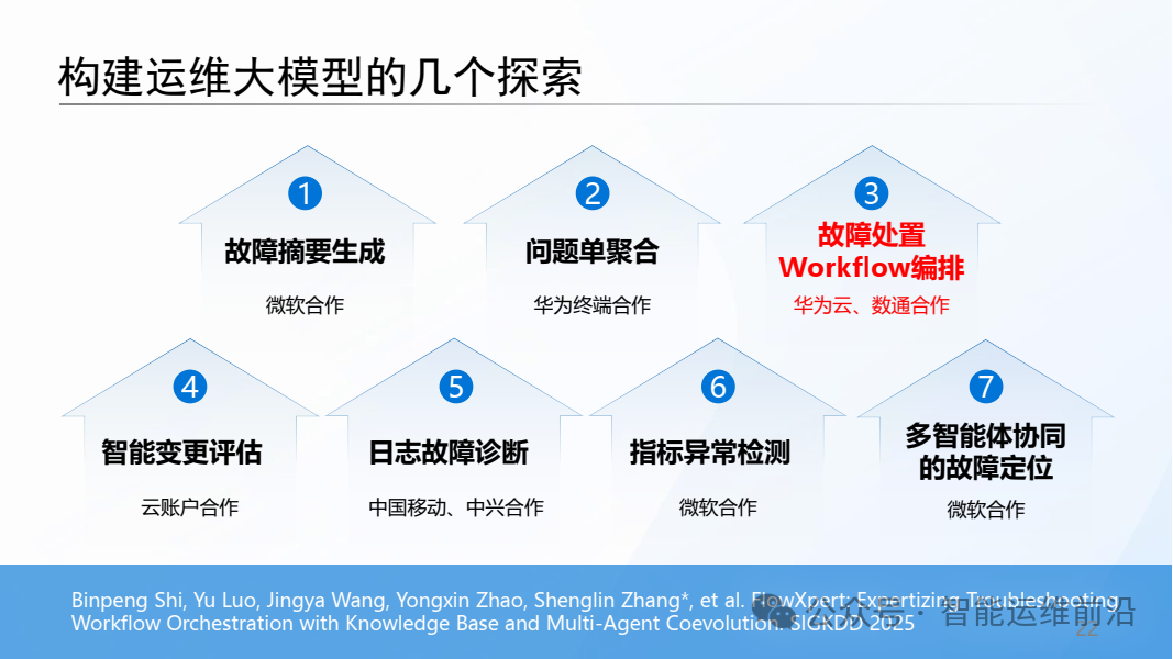 为攻克大模型在运维领域的局限性,张圣林携手微软、华为等企业展开探索,聚焦故障摘要、问题单聚合、故障处置Workflow编排、智能变更评估、故障诊断、异常检测等关键运维环节,借助大模型之力寻求突破。