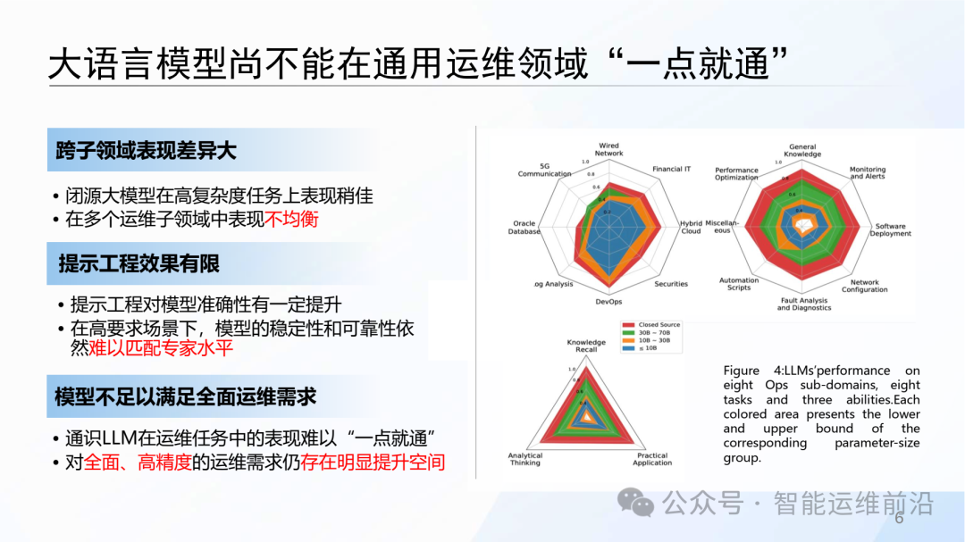 经过测评发现,大模型在跨领域的表现上存在显著差异。在不同的运维任务中,大模型的表现并不一致,尽管采用了多种提示工程方法,但这些方法在提升大模型性能方面的效果并不如预期。而且大模型目前还无法全面满足运维领域的复杂需求。运维任务的多样性和复杂性要求模型具备更精准的理解和处理能力,而大模型在这方面还有待提升。