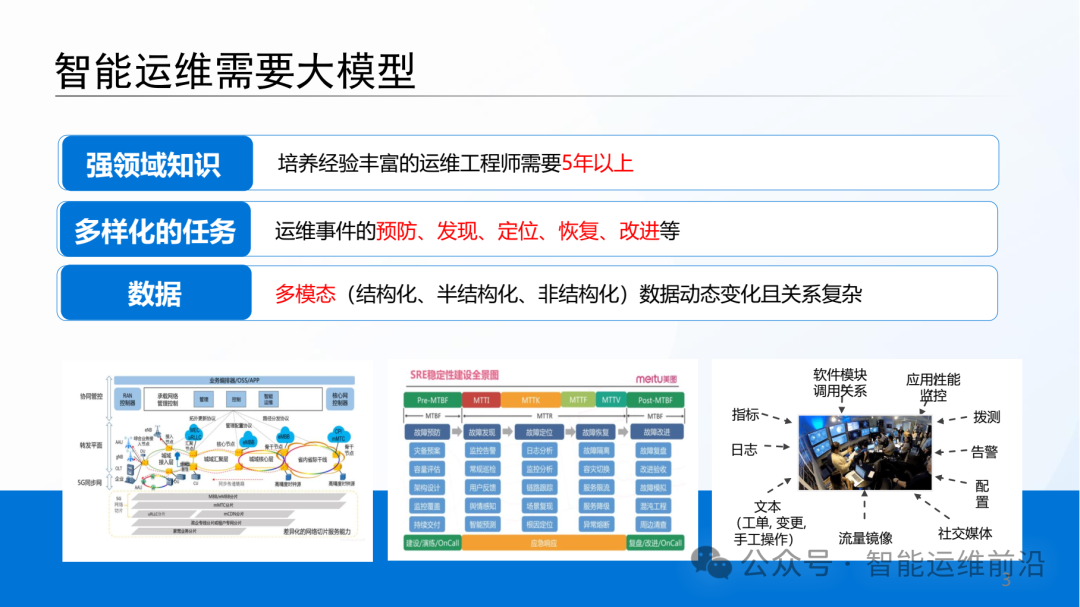 张圣林首先指出,大模型在智能运维中具有三大优势。一是,运维领域专业性强,培养一名经验丰富的运维工程师通常需要长达五年的时间。而大模型能够理解运维知识,并通过人机对话的方式处理运维事件,为解决运维人才培养难题提供了新的思路。二是,运维任务多样,企业以往需要为每个任务单独定制模型,成本高昂。大模型的多任务处理能力有望解决这一问题,从而提升运维效率。三是,运维数据类型多样,企业以往需要针对每种数据类型单独建模。而大模型的多模态数据理解能力能够整合多种运维数据,进而提升运维数据处理效率。
