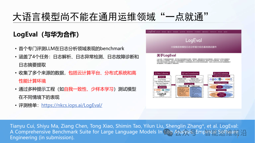 张圣林进一步介绍了在日志分析任务上的评估工作。日志作为一种类似自然语言的形式,本应是大模型大展身手的舞台。他们对日志分析的几个关键任务,包括解析、异常检测、故障诊断等进行了详细评估,收集了来自云平台、分布式系统等多个来源的日志数据,并通过多种提示工程进行了优化。