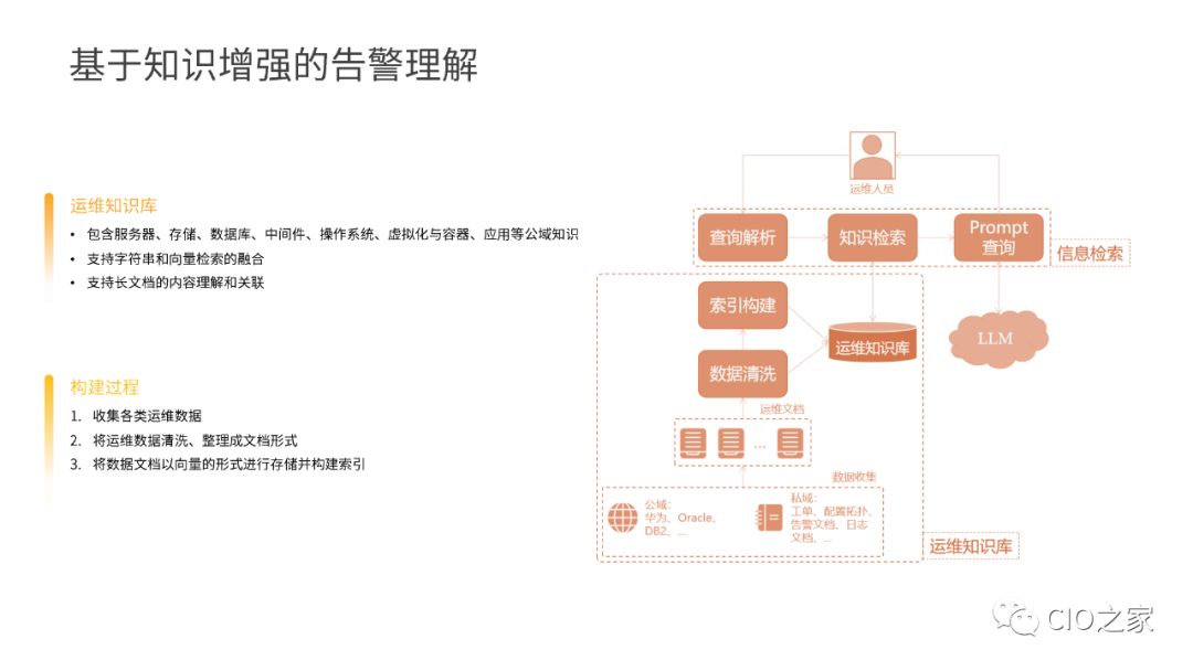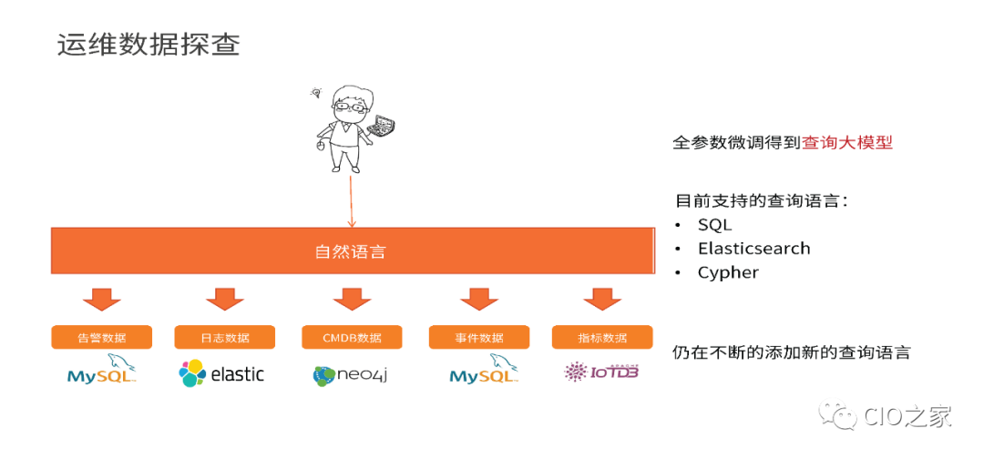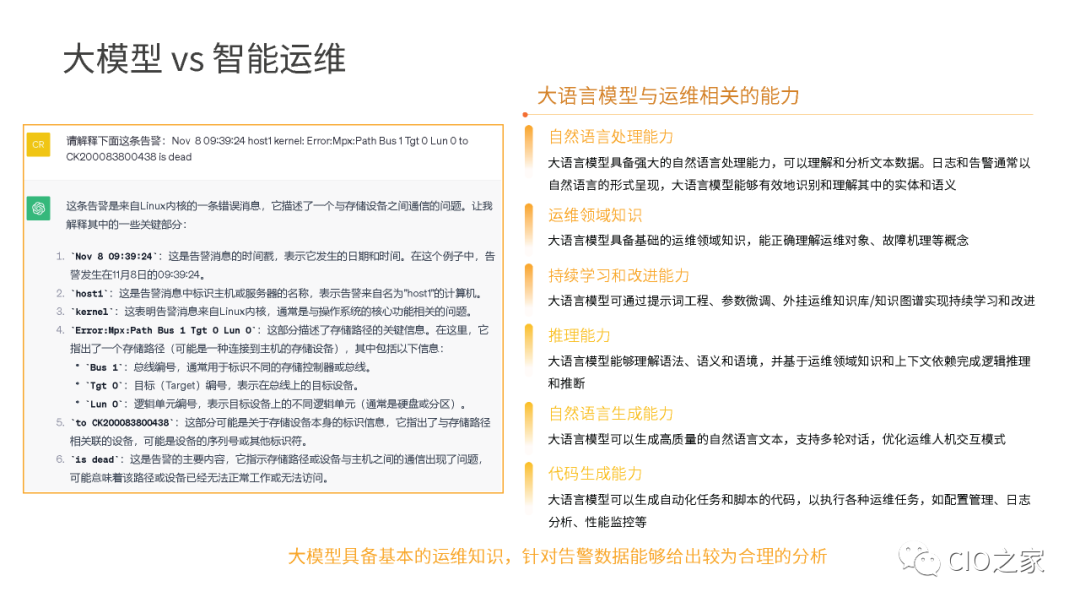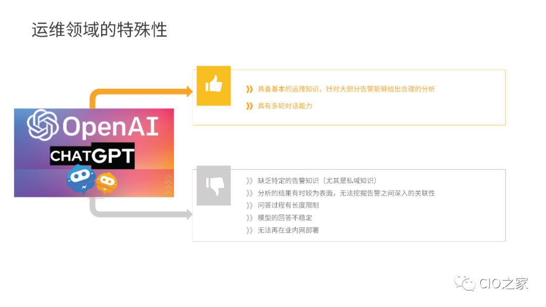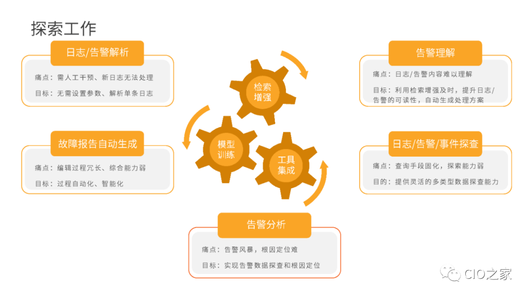 在没有AIGC能力加持的时候,智能运维主要做的是故障诊断、故障预测、趋势预测等,并不是一个完整的专家经验注入的过程。因为AIGC的出现,让我们看到了解决问题的新方法,就是把过往的知识注入进去,将知识、算法相关联,最终实现完全智能化、自动化的故障发现、诊断和修复。