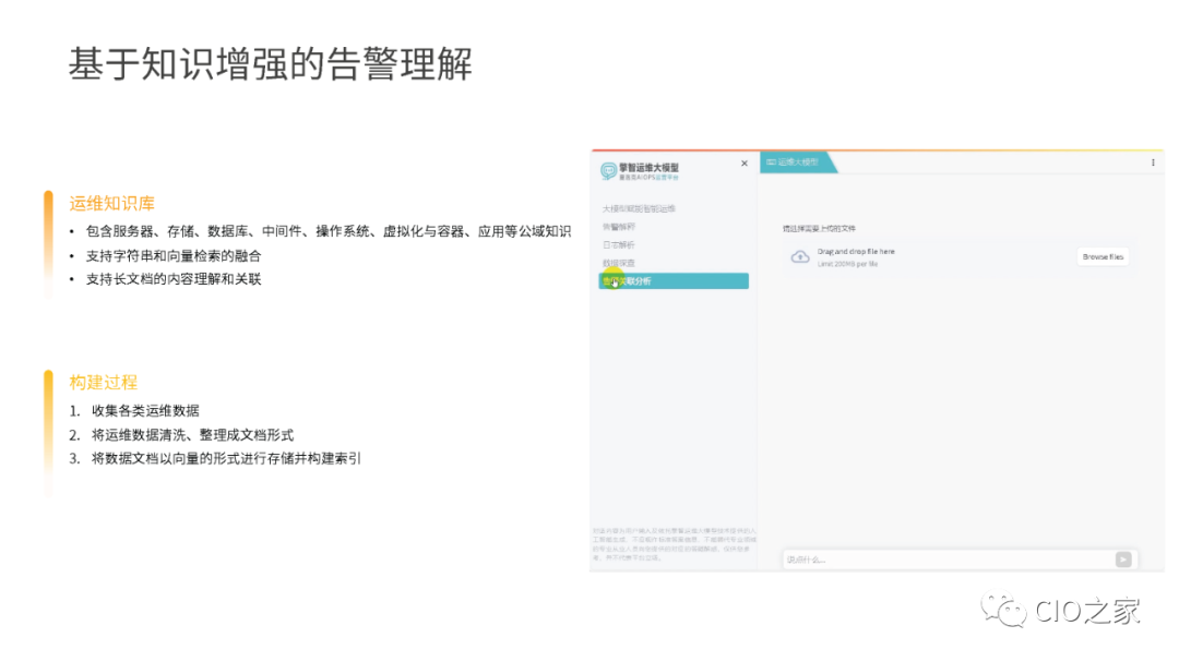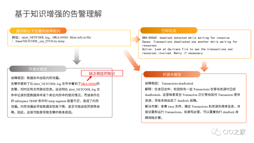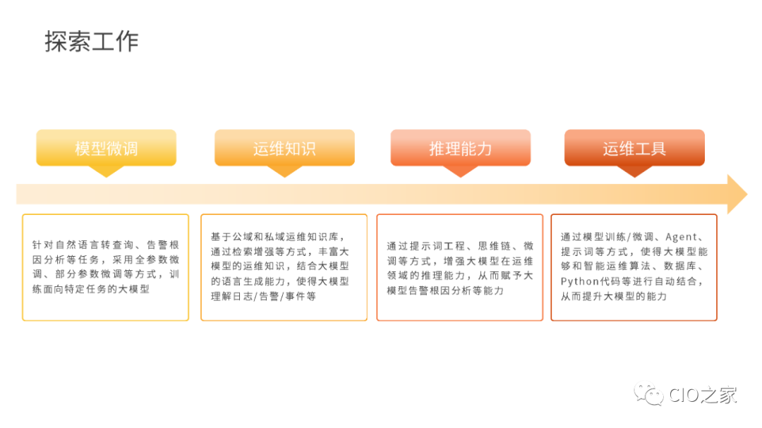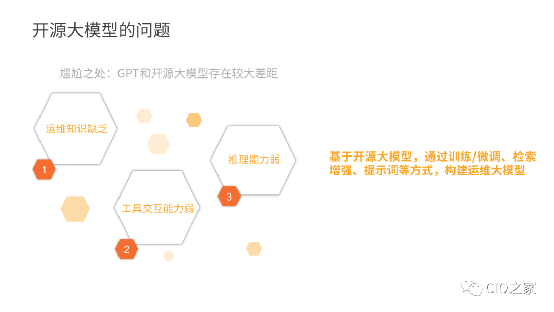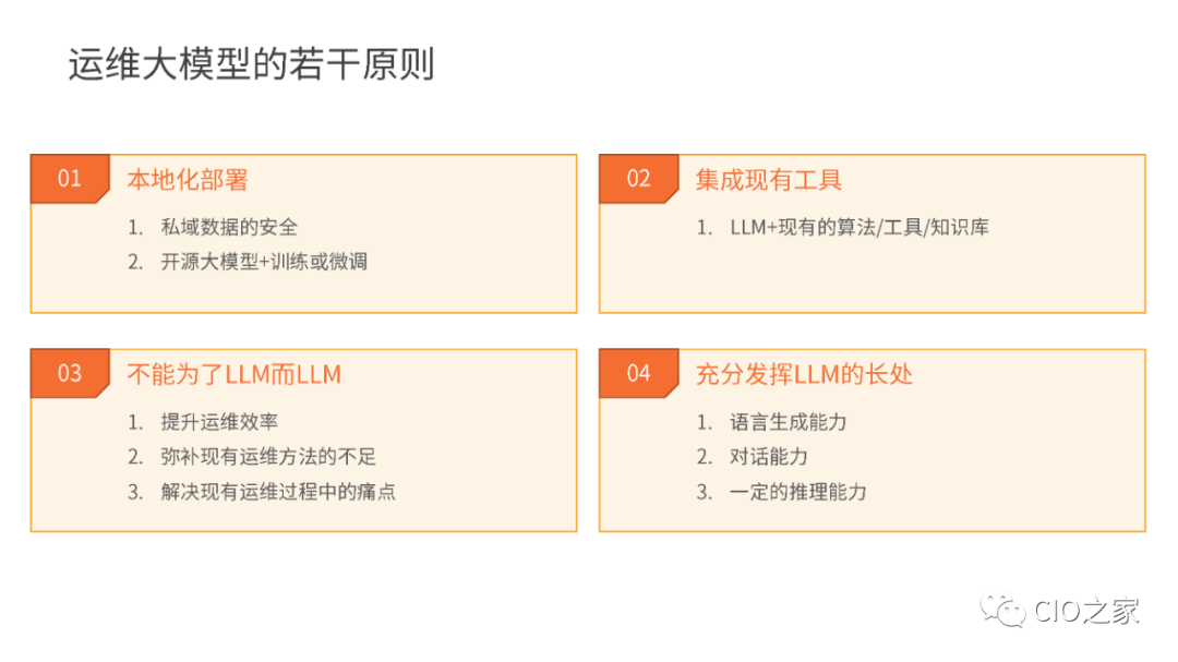 在没有AIGC能力加持的时候,智能运维主要做的是故障诊断、故障预测、趋势预测等,并不是一个完整的专家经验注入的过程。因为AIGC的出现,让我们看到了解决问题的新方法,就是把过往的知识注入进去,将知识、算法相关联,最终实现完全智能化、自动化的故障发现、诊断和修复。
