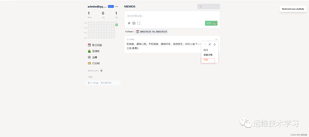 1.部署快速方便,可以部署在个人本地服务器。 2.开源项目,可供个人日常学习记录使用。 3.界面美观,符合国人日常使用习惯。 4.操作简单,小白也很容易上手使用。 5.使用体验良好,可以记录碎片化知识要点,很有用的工具。
