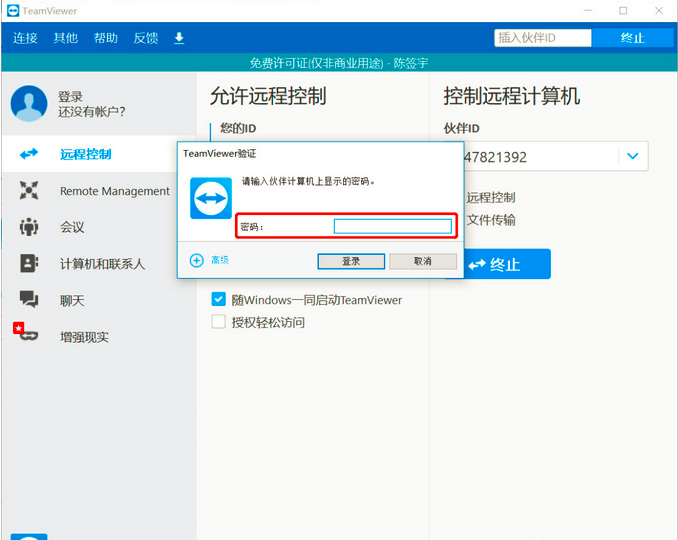 ②如果您是远程方,需要得到被远程方的ID和密码,在方框3中填入被远程方的ID,之后点击方框4中的连接,并且在之后跳出的TeamViewer验证窗口中(如下图所示)填入对应的密码登陆即可;