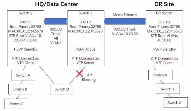 然而,灾难恢复站点的交换机认为,它是该干线上未使用的其他VLAN的STP根。
