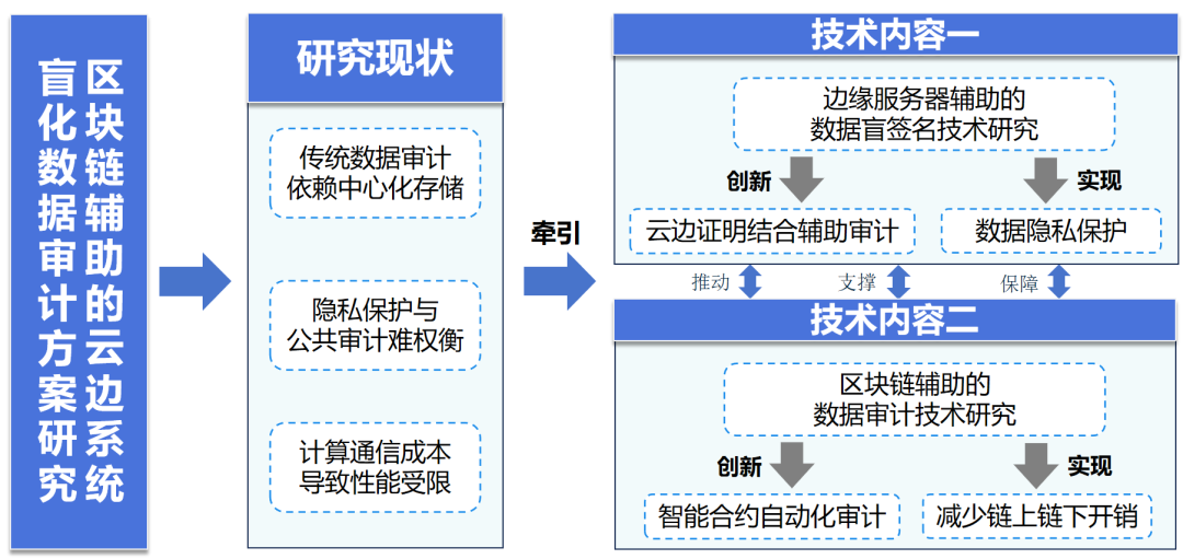 本研究针对云边协同场景下数据审计过程中存在的隐私泄露、中心化依赖与审计透明度不足等问题,提出了一种区块链辅助的盲化数据审计方案。该方案结合了轻量级标签生成、盲签名技术与区块链不可篡改特性,实现在不泄露数据内容的前提下对外包数据进行高效、可追溯的完整性验证。通过这一方案,不仅能够提升数据审计的透明度和可信度,还能够在不暴露敏感数据的前提下,实现对数据流转的有效监控。