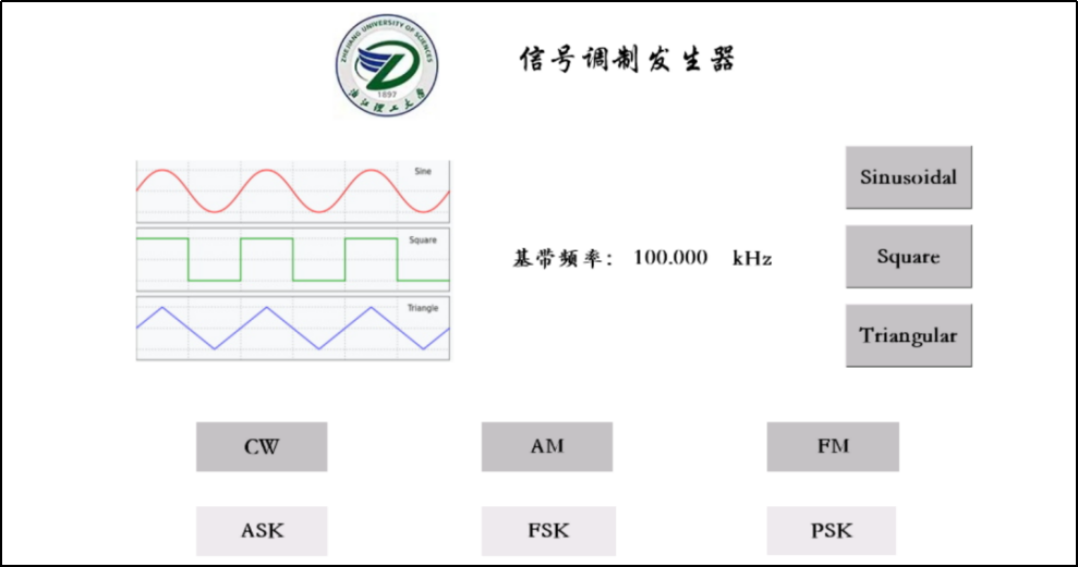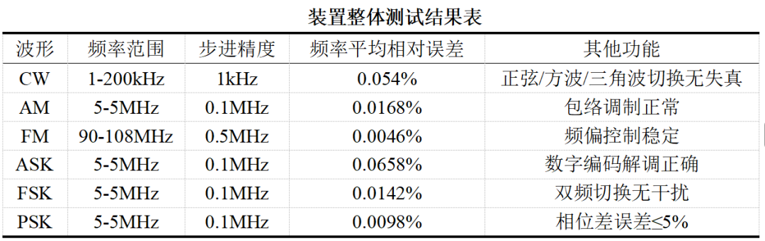 实验结果表明:CW波形在0.1Hz~10MHz频率范围内可稳定输出,频率误差控制在0.05%以内;AM波形包络清晰,载波幅度随基带信号变化准确,频率误差小;FM波形频率准确,频偏与调制灵敏度匹配良好;ASK、FSK与PSK波形跳变及时,码元识别度高,信号上升/下降沿清晰,适用于数字通信实验。具体结果如表所示: