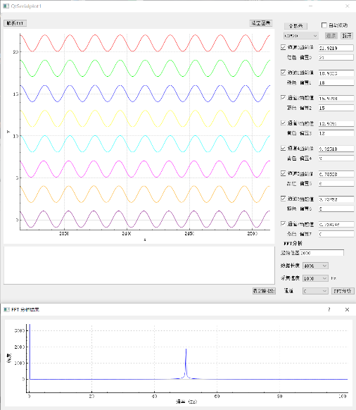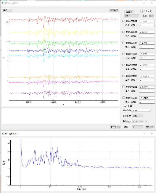 2)通过基于QT5.14框架的上位机程序设计,利用Qcustomplot绘图库实现了8个通道1kHz采样率(即每秒8000个采集点)的表面肌电信号的实时动态解析显示功能。同时该上位机还具备FFT频谱分析等功能,帮助用户对肌电信号做进一步的分析处理。