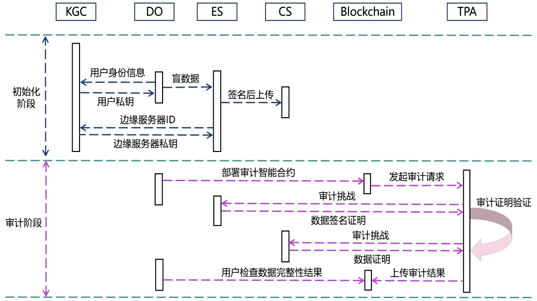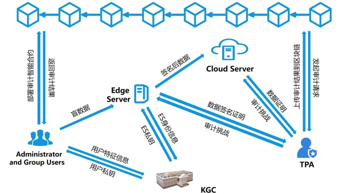在分布式大规模智能计算领域,云服务器与边缘设备的高效协同可以将云端强大的存储计算能力与边缘端的低延迟响应优势有效整合起来,为海量数据的实时处理以及分布式资源调度提供有力支撑。然而,随着数据规模呈指数级增长以及安全威胁变得日益复杂,云边系统在用户私有数据的存储和共享过程中面临隐私保护与完整性验证的双重挑战:一方面,传统审计方案依靠中心化可信第三方,在数据完整性验证时会面临信任危机与单点失效等问题;另一方面,审计过程缺少透明性与可追溯性机制,致使数据争议出现时责任界定困难,很难对云端进行有效问责。针对上述这些问题,本研究提出一种区块链辅助的云边协同盲化数据审计方案。