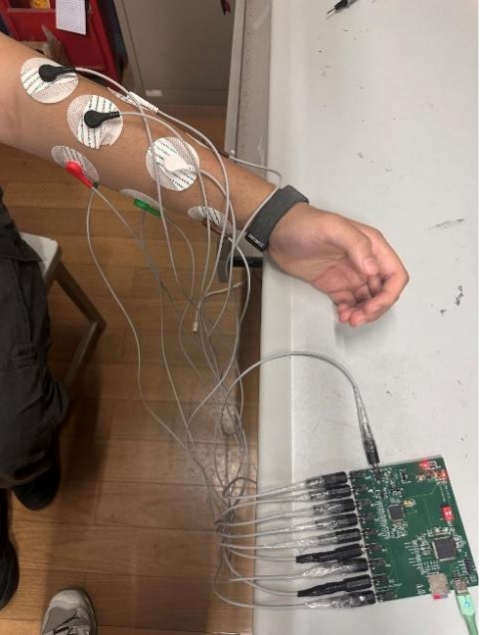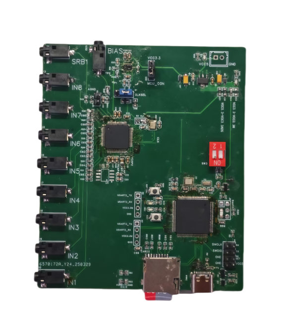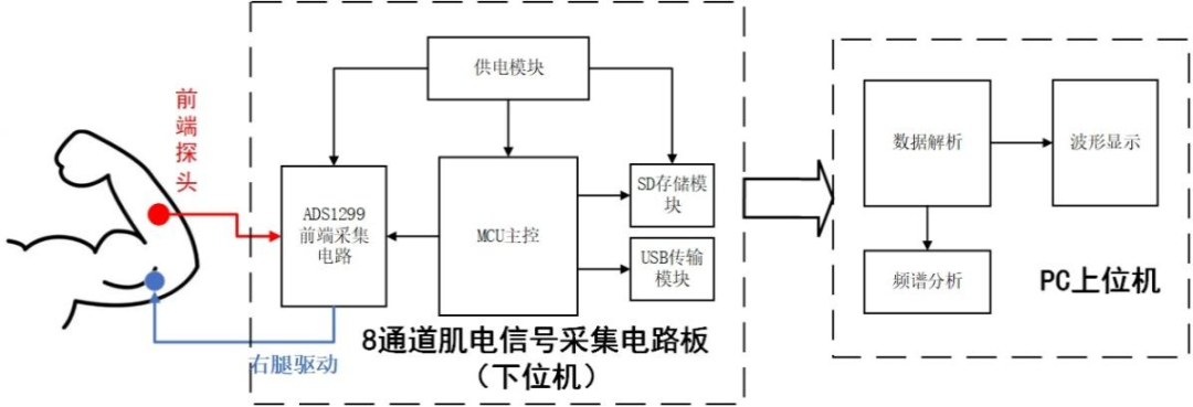 1)设计了一块8通道肌电信号采集下位机。其设计基于ADS1299与STM32芯片进行设计,能同时采集8个独立通道的肌电信号。采集板可以将采集到的肌电信号通过USB实时传输给上位机,并实现了将数据不间断地存入TF卡中的功能。