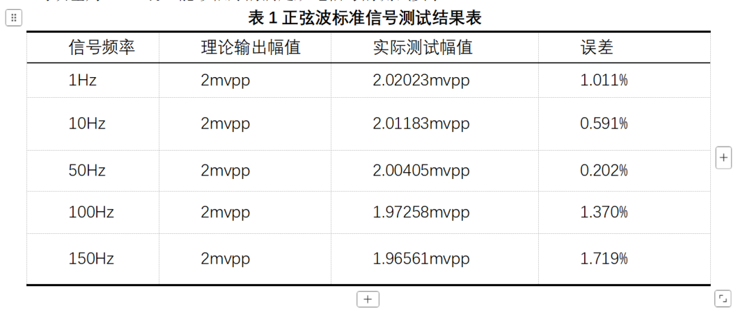 本系统选择了幅值均为2mvpp的1Hz~150Hz正弦波作为测试的参考信号。测试结果如表1所示。通过测试可以发现该系统测试在肌电信号的有效频率范围内采集精度较高,平均误差为0.704%,能够很好的满足肌电信号的测试要求。