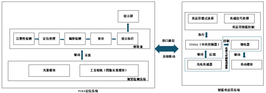 1.搭建定位实验平台,选用 200W 像素 COMS 相机与 LED 背光源完成图像采集,以 STM32F407为控制器,结合光电传感器与继电器搭建智能传送带系统。