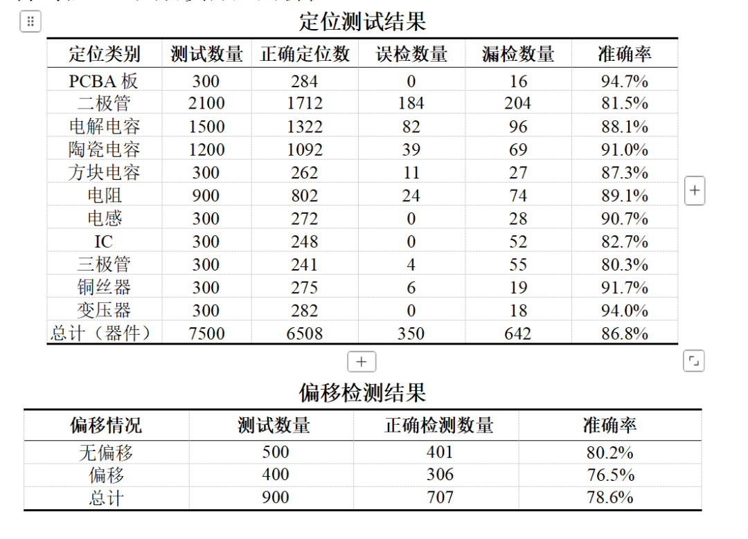 本次设计的整体检测系统基于Resnet34、YOLOv8和YOLOv8-GAM等网络模型,在300次检测中对300张PCBA板及7500个、十类元器件进行定位测试,PCBA板定位准确率达94.7%,器件总体定位准确率86.8%,其中铜丝器、陶瓷电容等大尺寸或特征明显器件准确率超90%,小尺寸器件因运动模糊、光照不足等因素漏检率较高;对900个电解电容的偏移检测总准确率为78.6%,满足基本检测需求;对比传统机器视觉算法(最大矩形轮廓匹配、霍夫圆检测),深度学习算法在PCBA板和电解电容定位中准确率分别达91.0%和84.3%,显著优于传统方法的82.0%和80.0%,得益于神经网络对图像特征的全面提取能力。该系统虽在复杂场景下对小尺寸器件检测存在优化空间,但整体凭借深度学习技术实现了PCBA板与元器件的高效定位及偏移检测,实用性与有效性得到验证,具备实际应用价值。