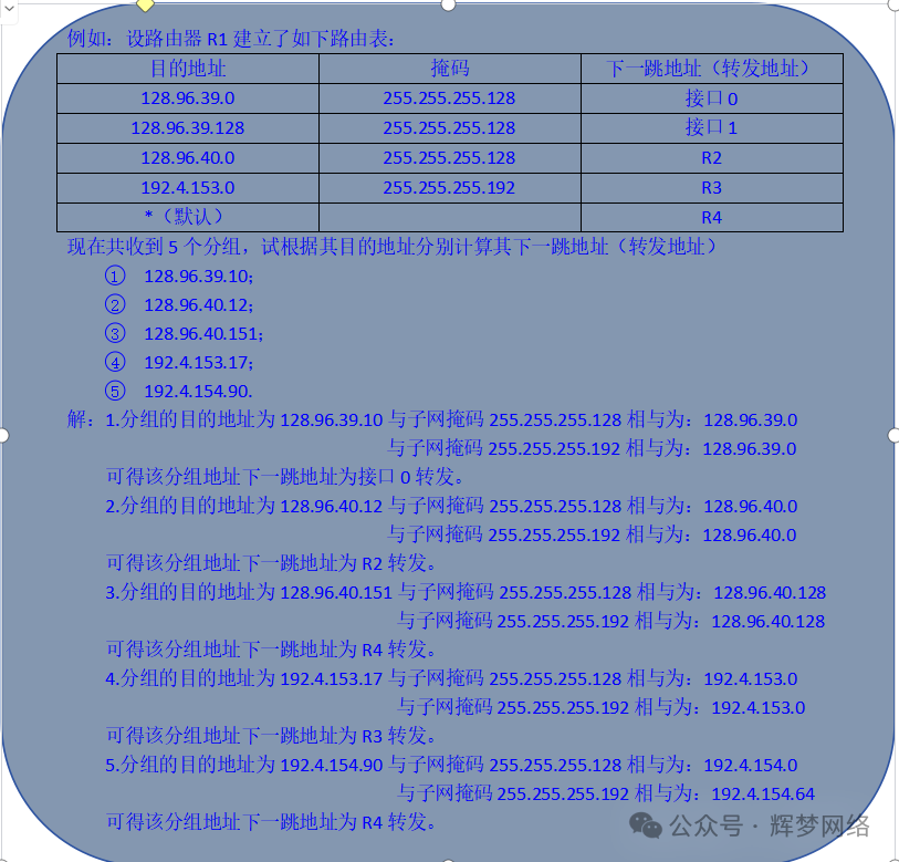 ② 若结果出现在路由表目的地址中则转发相对应得下一跳地址;
