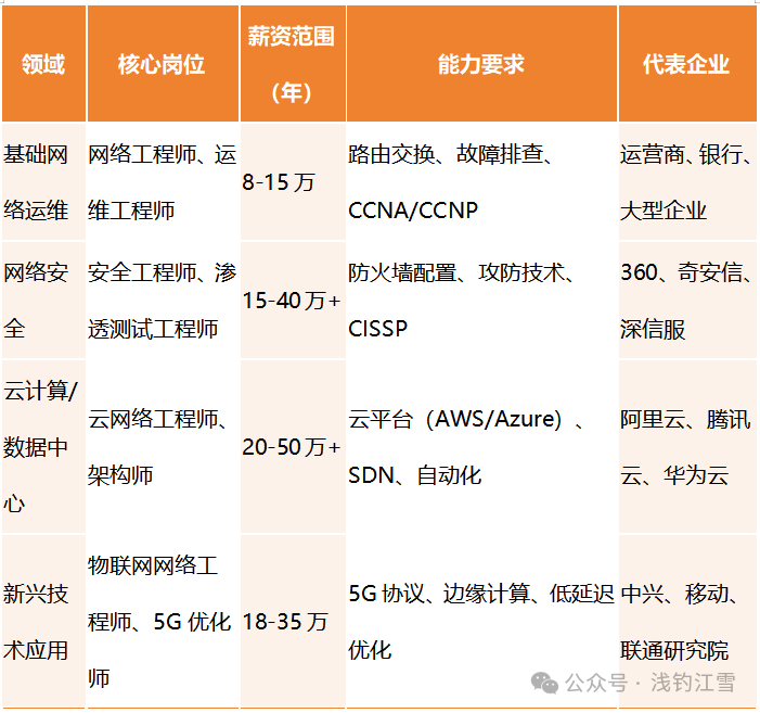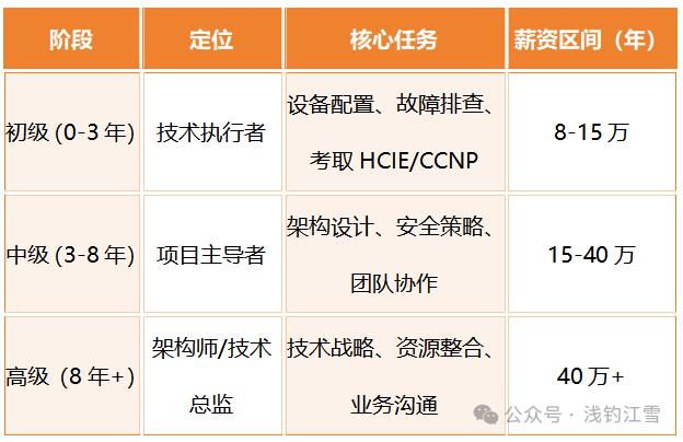 职业护城河:技术深度(SDN/安全)+ 认证背书(HCIE/CISSP)+ 垂直领域知识(如工业物联网),是应对行业波动的黄金三角。