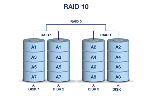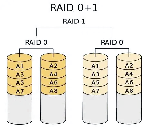 根据组合分为RAID 10和RAID 01,实际是将RAID 0和RAID 1标准结合的产物,在连续地以位或字节为单位分割数据并且并行读 /写多个磁盘的同时,为每一块磁盘作磁盘镜像进行冗余。