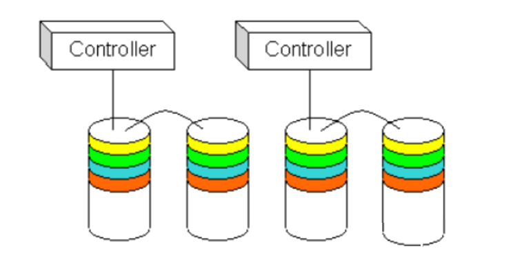 为了避免出现性能瓶颈,使用多个磁盘控制器就显得很有必要。下图示意了使用两个控制器的磁盘镜像。