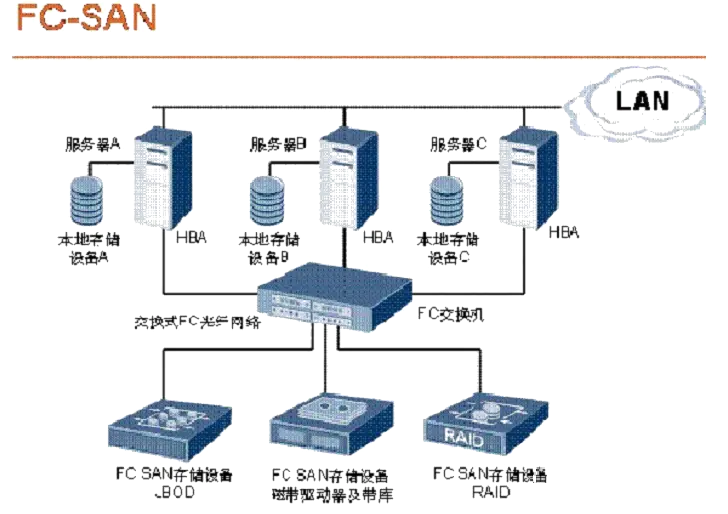 FC-SAN的硬件基础设施是光纤通道,用光纤通道构建的 SAN由以下三个部分组成:
