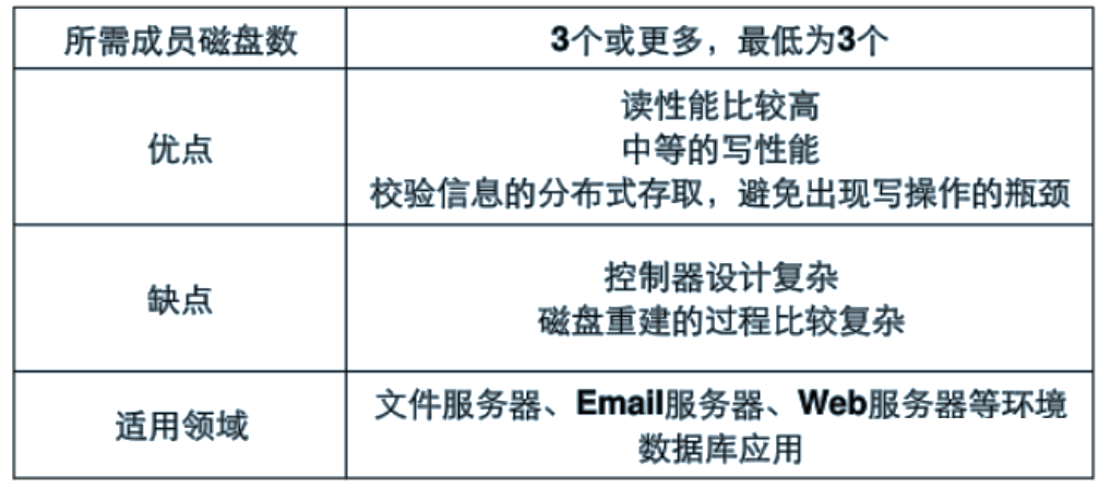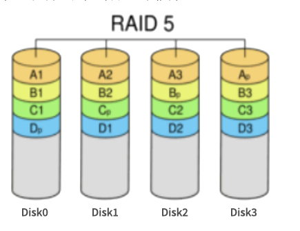 RAID 5不单独指定的奇偶盘,而是在所有磁盘上交叉地存取数据及奇偶校验信息。