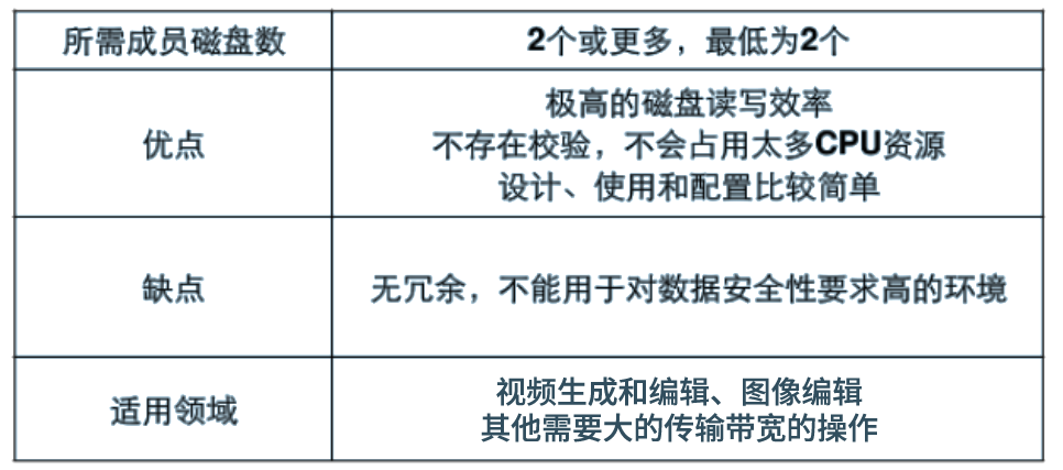 备注:至少3块盘 只允许坏一块盘 读写性能好 坏掉一块盘读性能变慢