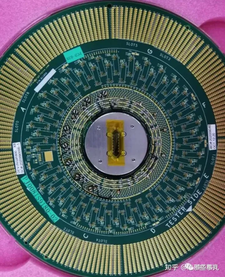 而probe card则换成了load board,其作用是类似的,但是需要注意的是load board上需要加上一个器件—Socket,这个是放置package device用的,每个不同的package种类都需要不同的socket,如下面上图所示,load board上的四个白色的器件就是socket。